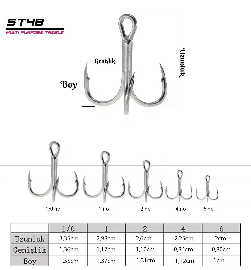 Yeni Fujin ST48 Tornado Üçlü Maket Balık İğnesi, Maket balıklarınız için özel olarak tasarlanmış fiyat performans ürünlerinden. Çapraz özelliği sayesinde avlarınızı daha garanti yapmanıza olanak sağlar. Maket balıklarınızın boyuna göre farklı numaralarını seçerek kullanabilirsiniz. Nickel kaplamalıdır, ekstra keskindir.