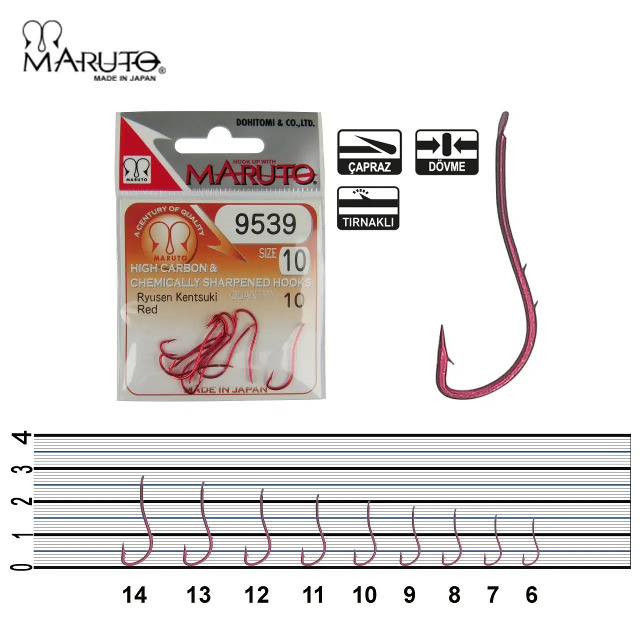 Maruto 9539 Ryusen Kentsuki iğnelerinin sap kısmında bulunan çift tırnak iğneye takılan kurdun geri kaymasını önleyecek şekilde tasarlanmıştır.