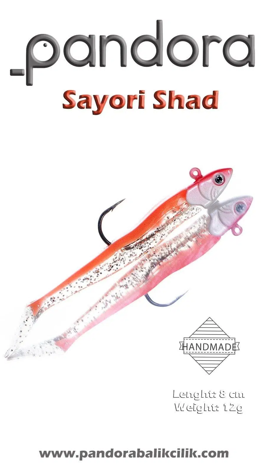 Sayori shad silikon 8 cm ve 12 gr ağırlığındadır. Ürün tamamen el yapımıdır. Yumuşak ve esnek silikon yapısı ürünün avcılığını arttırmıştır. Ürün renklerinin bazıları içerisinde glow ve uv özellikleri barındırmaktadır. Gece ve gündüz avlarında kullanıma uygundur. Paket 2 adet 8 cm gövde ve 1 adet 12 gr jig head'den oluşmaktadır.